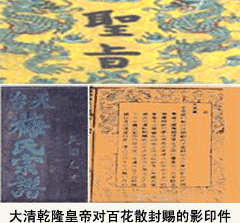 中國抗癌協會常務理事、河南省抗癌協會會長楊文獻教授和《百花散》傳人梅先生合影中國抗癌協會常務理事、河南省抗癌協會會長楊文獻教授和《百花散》傳人梅先生合影 據梅氏族譜記載,明末清初年間天臺縣深山有梅氏長者為當地草藥郎中,在深山采藥時,偶然進入人跡罕至的深澗,澗中飛瀑從天而降,懸崖峭壁環繞,古樹參天,奇花異草,蝶舞蜂飛,巖壁長滿靈蘭(鐵皮石斛仙人草)。深澗山洞中,有一石棺,棺中著明代服飾的白須老者栩栩如生,衣著完好;石桌有明朝正德年間治病強身《百花散》手抄醫書及白絹一幅,上有消化道腸胃、鼓漲病(肝腹水)、風濕關節等疾病配制方法。先人獲此神書神方,后依方所示,采澗中峭壁上之靈蘭、三七、猴頭菇和麝香等奇花異珍配制成不同系列的《百花散》,治療山民常見的消化道腸胃疾病、鼓漲病(肝腹水)、風濕關節疾病有奇效。山民食之,有病治病,無病健身。當地山民多長壽,童顏鶴發、身體強健的百歲老人隨處可見,均得益于神方《百花散》。當地民眾口碑相傳,美譽百花散為'神藥'、'藥王'。先人由此名聲大振,驚動大清朝庭,乾隆年間,皇帝多次下旨招先祖入朝并封賜。